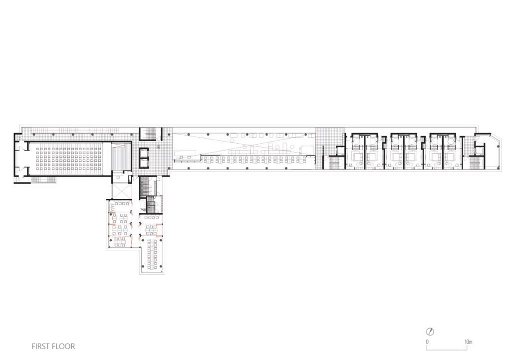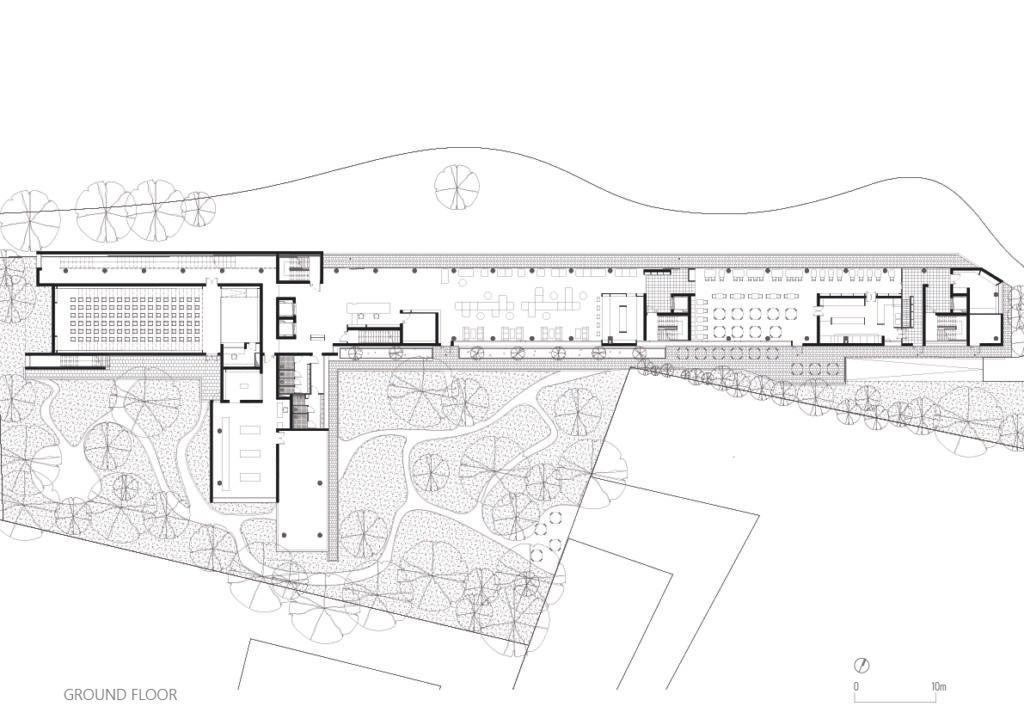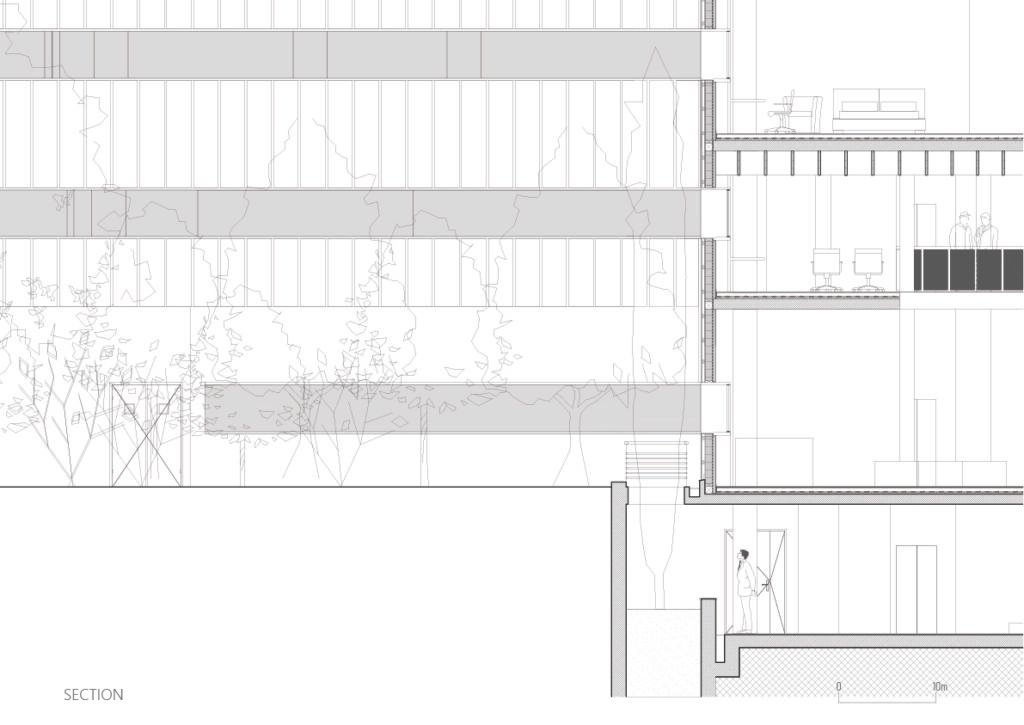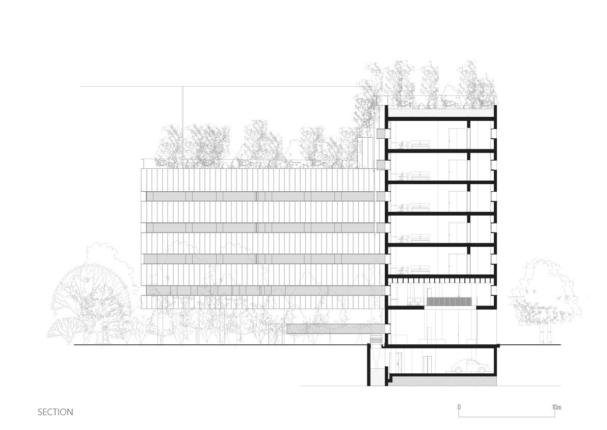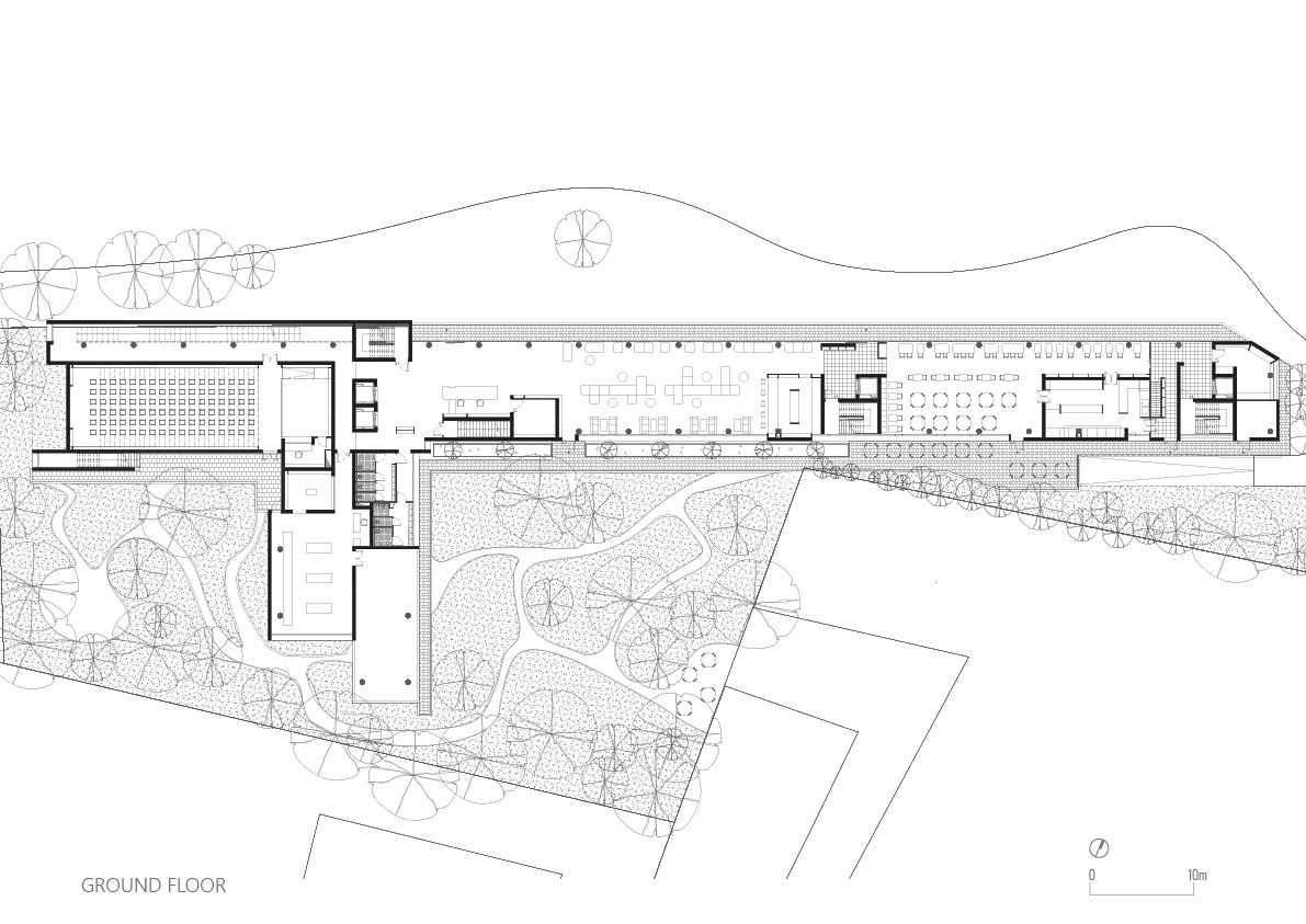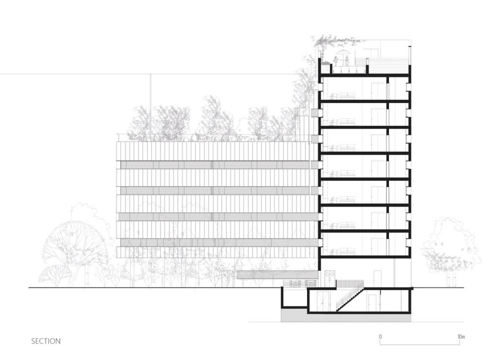 • Basement: Naturally lit parking, logistics, administration, and a multi-purpose hall seating 102 people.