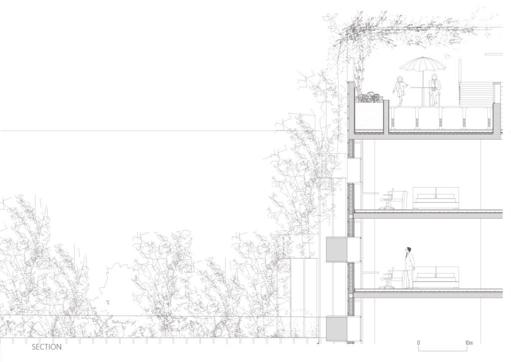 The concept is based on a protective rectilinear figure. To counter noise pollution: