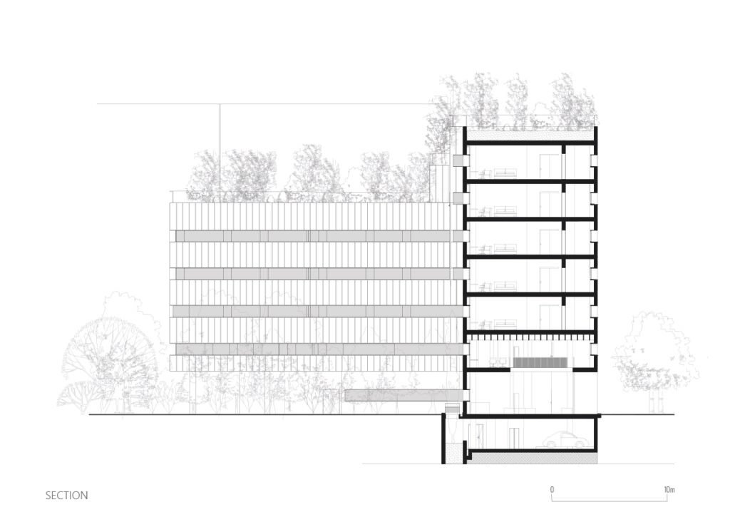• An insulating thickness (serving as the distribution circulation) is placed on the street side, acting as a shield.