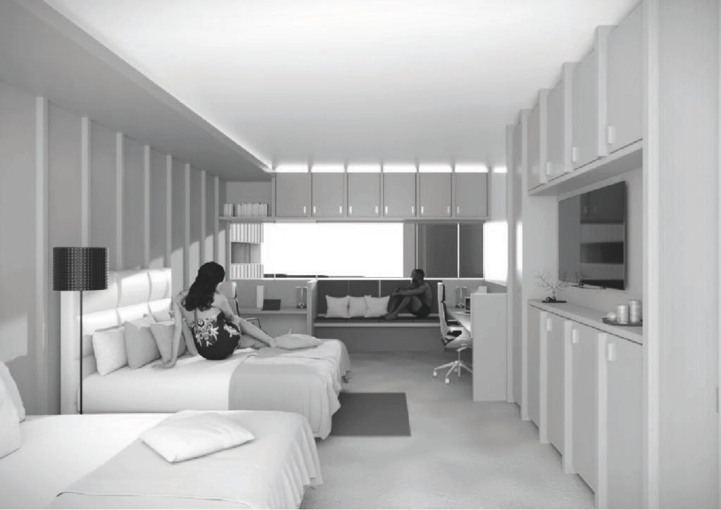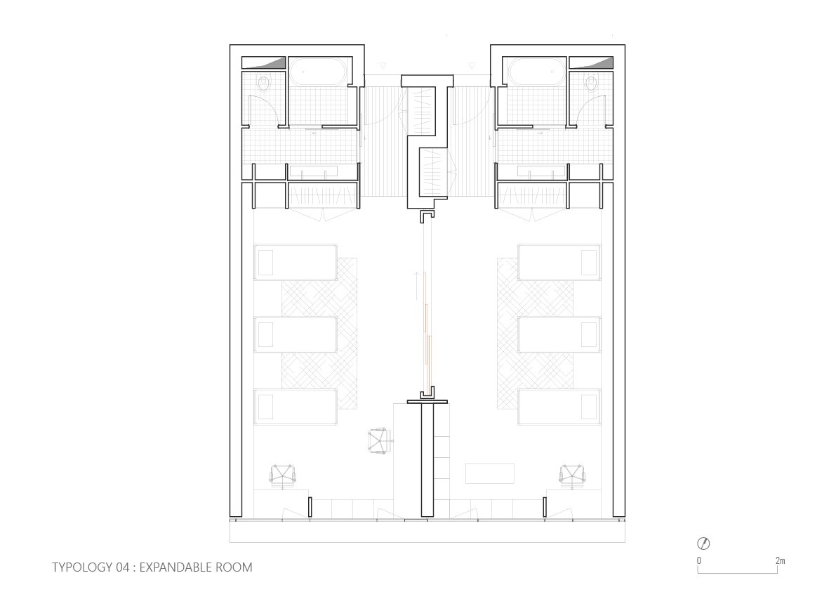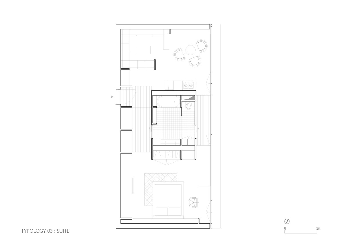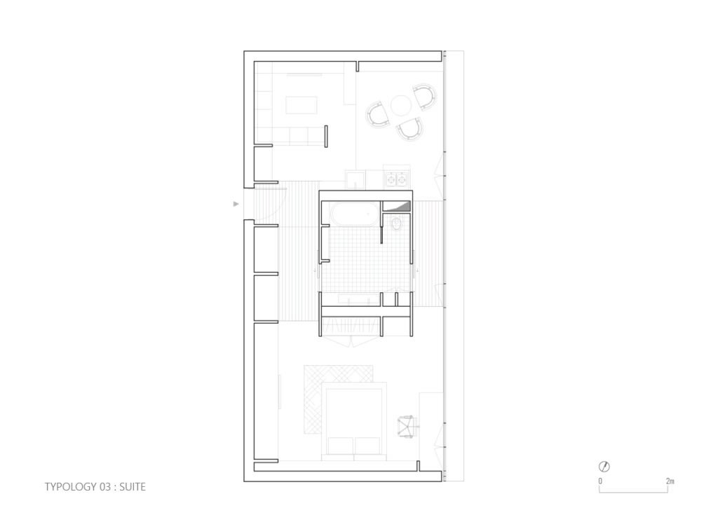 • Bathrooms and wall-integrated storage are positioned along the north facade to reinforce acoustic insulation.