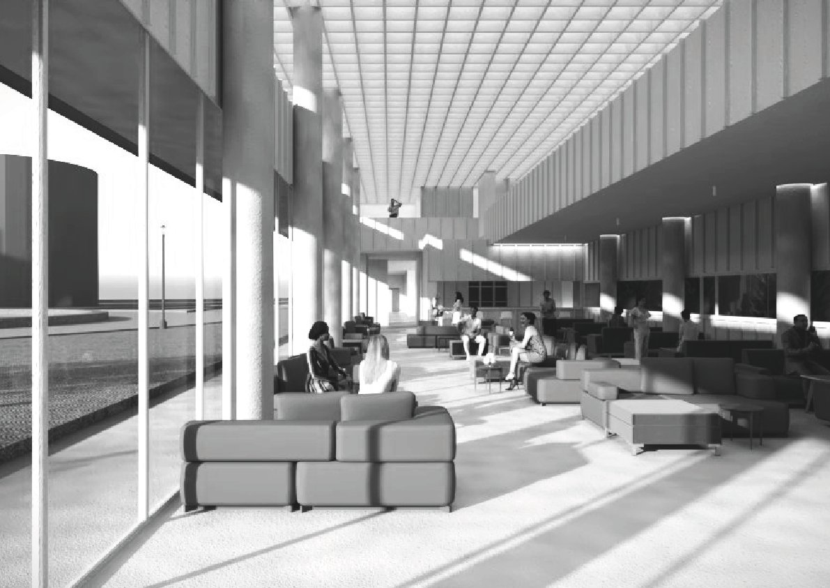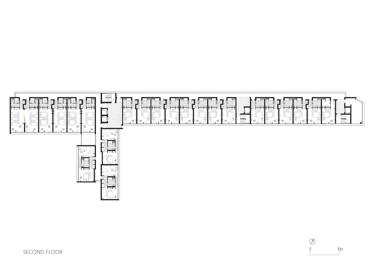 • Ground Floor: Double-height reception and lobby, bar, restaurant open to the public, and an art gallery.